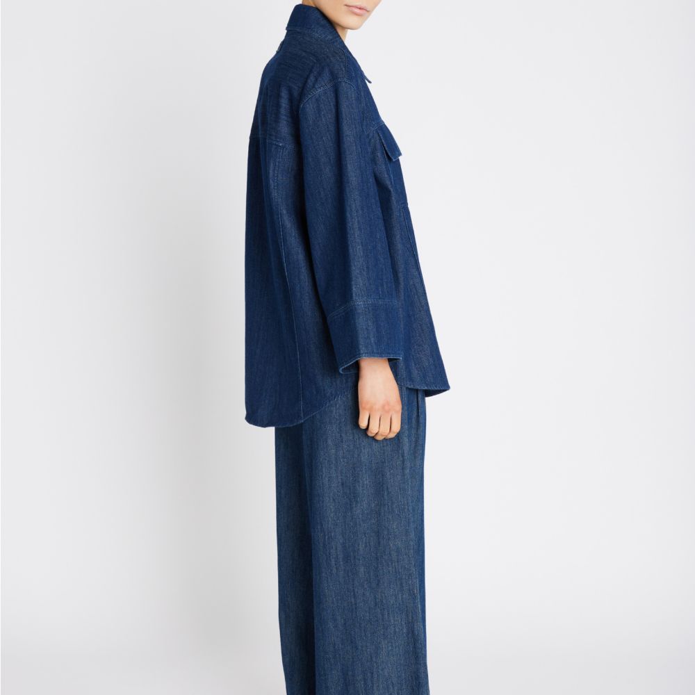Blød denim buks med brede ben, har små læg foran og en bred linning. Bukserne lukkes i siden.