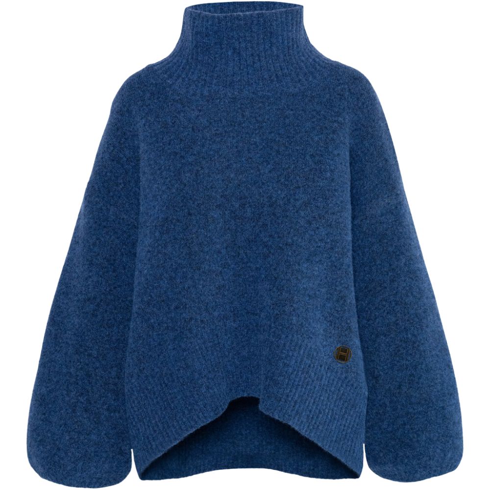 Strikket trøje med lange ballonærmer og høj krave og lidt længere bagside.