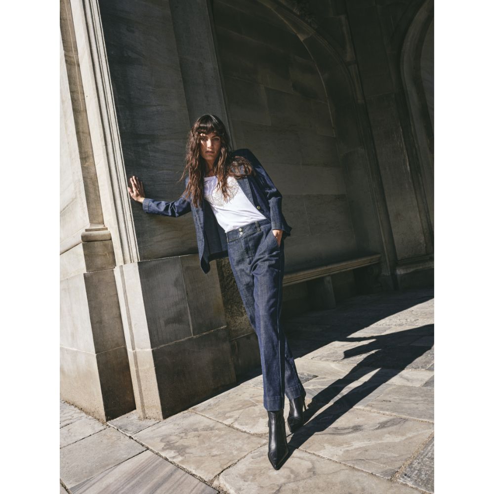 Ankel Denim med brune syninger, skrå lommer, smalle ben med en lille slids i siden.