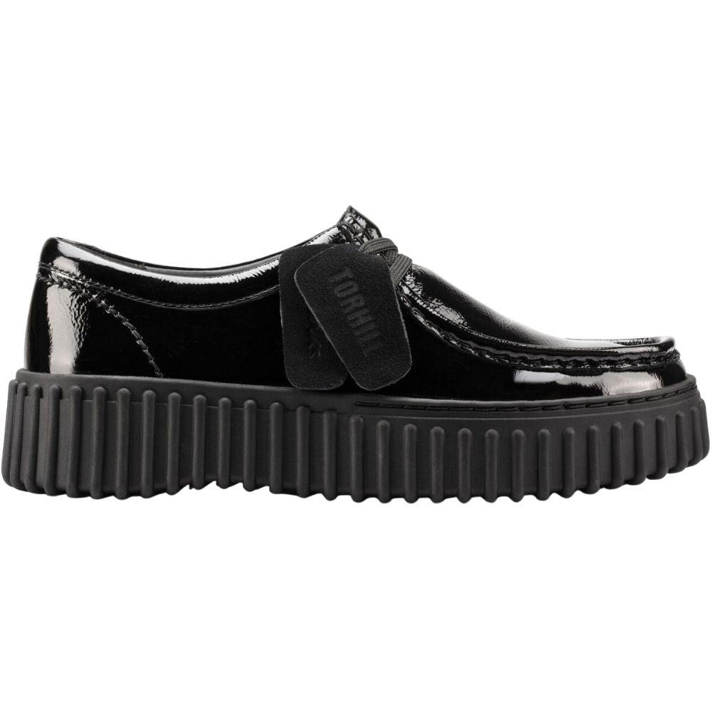 Clarks Torhill Bee sko til dame i sort lak. Overdelen i blødt skind giver en behagelig og fleksibel pasform, mens snørebåndene gør det muligt at justere pasformen. Indvendigt er den udstyret med en udtagelig skindsål med ekstra polstring.