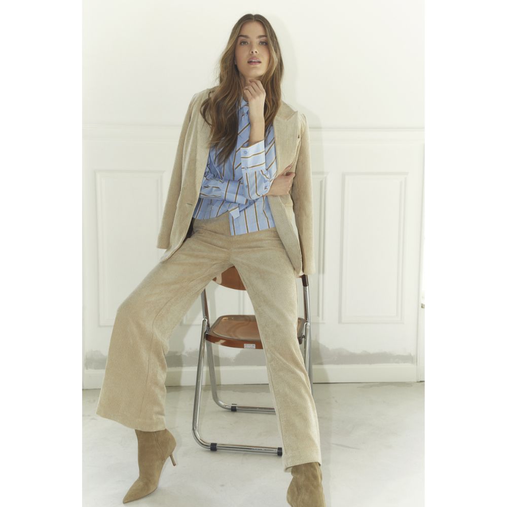 Sand farvet bukser fra Co' Couture, de er lavet i et blødt fløjs materiale og med en afslappede pasform samt elastik i taljen. Bukserne er med detaljer som skrålommer på siderne og med lige ben.