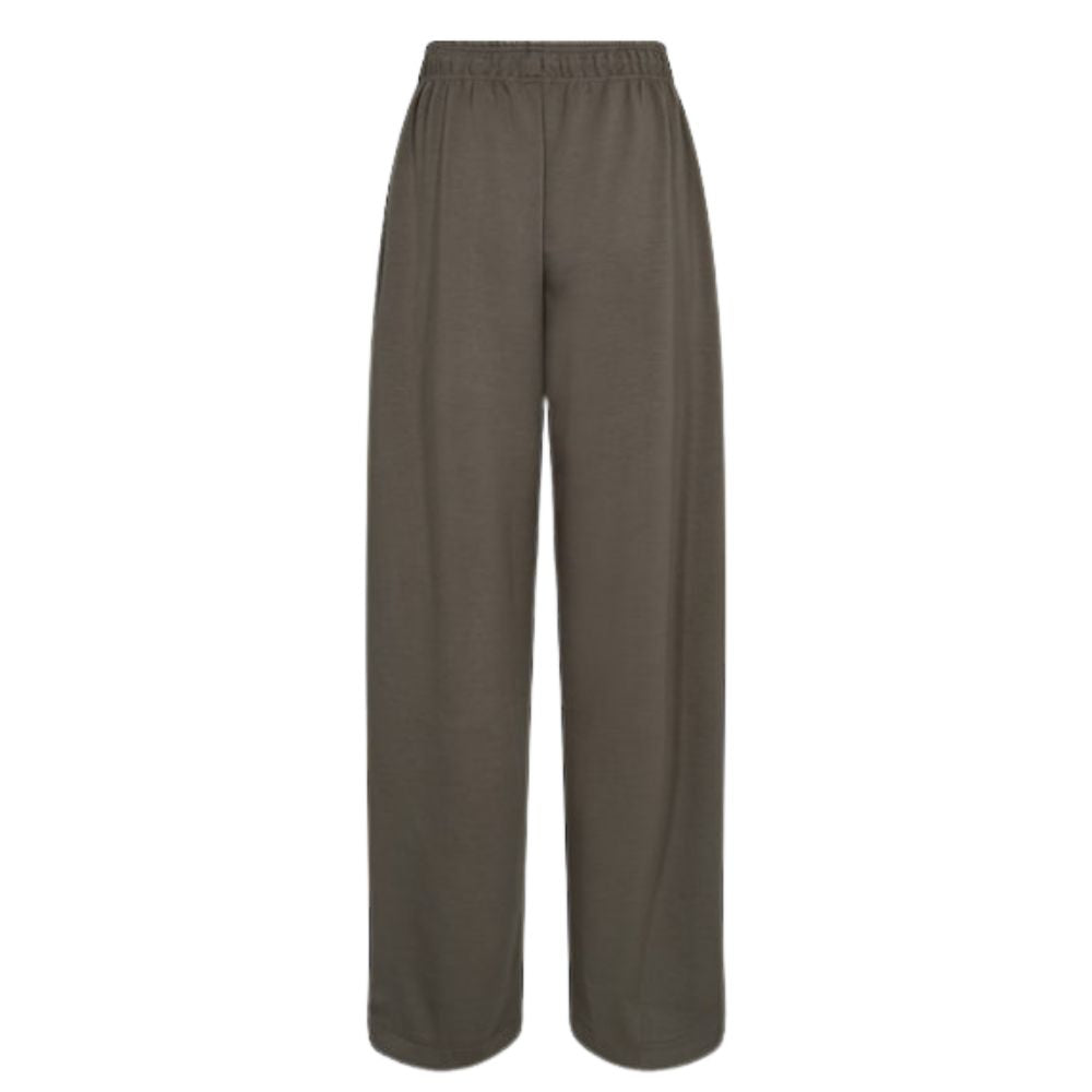 Sweat pant i mørkebrun, med elastik i livet, lommer i side sømmene og brede ben.