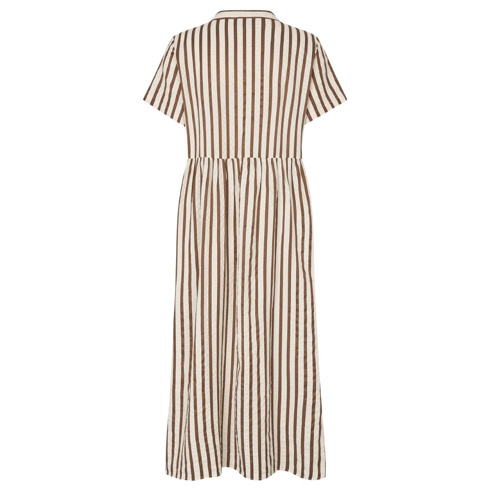 Aliya kjole fra Lollys Laundry er med smukke lodrette stribe. Kjolen er med knaplukning foran og en let rynket skæring i taljen, som giver et flot fald og korte ærmer.