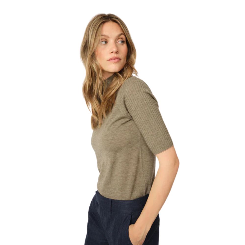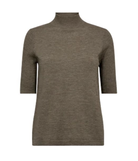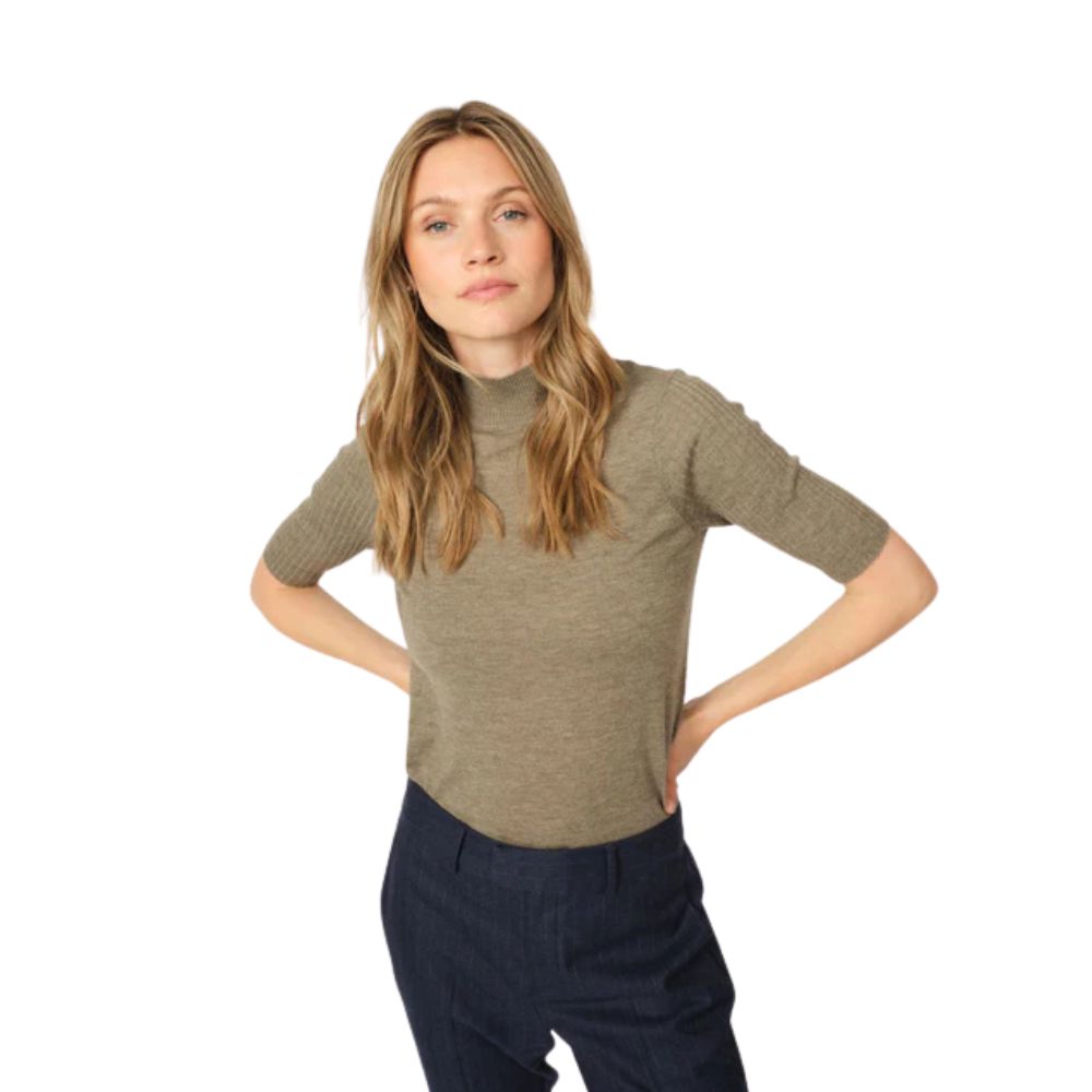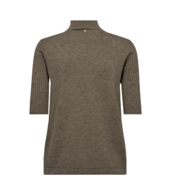 Brun Mos Mosh strik som er designet i en regulær pasform og lavet af en blød uldblanding. Den er med elegant rullekrave, ¾-ærmer, og med ribkanter.
