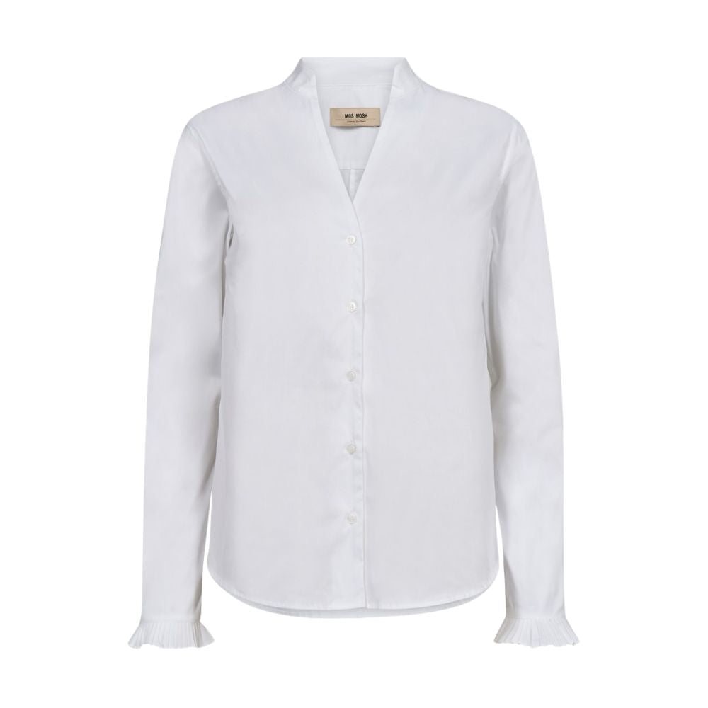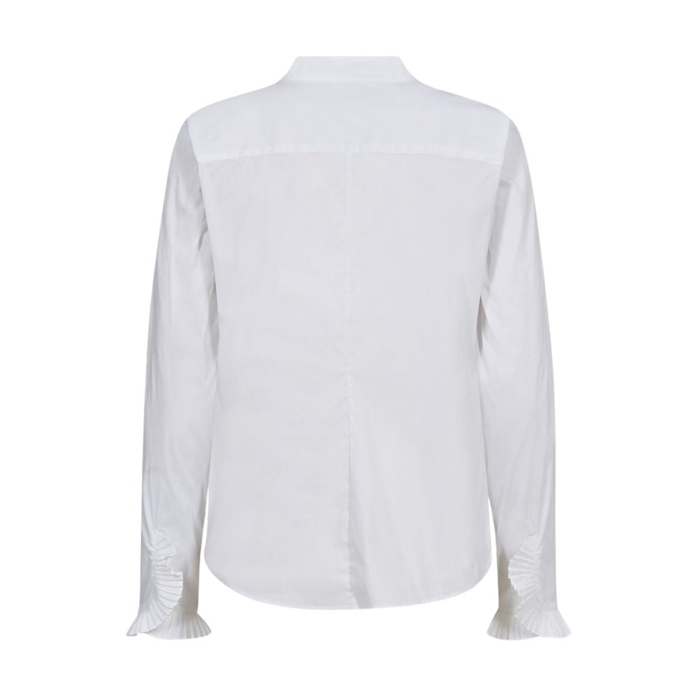 Hvid bluse designet i en tætsiddende silhuet, med V-hals og knaplukning samt flæsemanchetter.